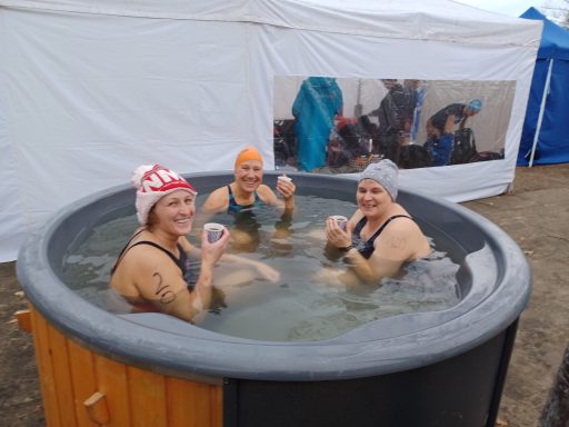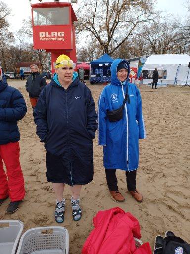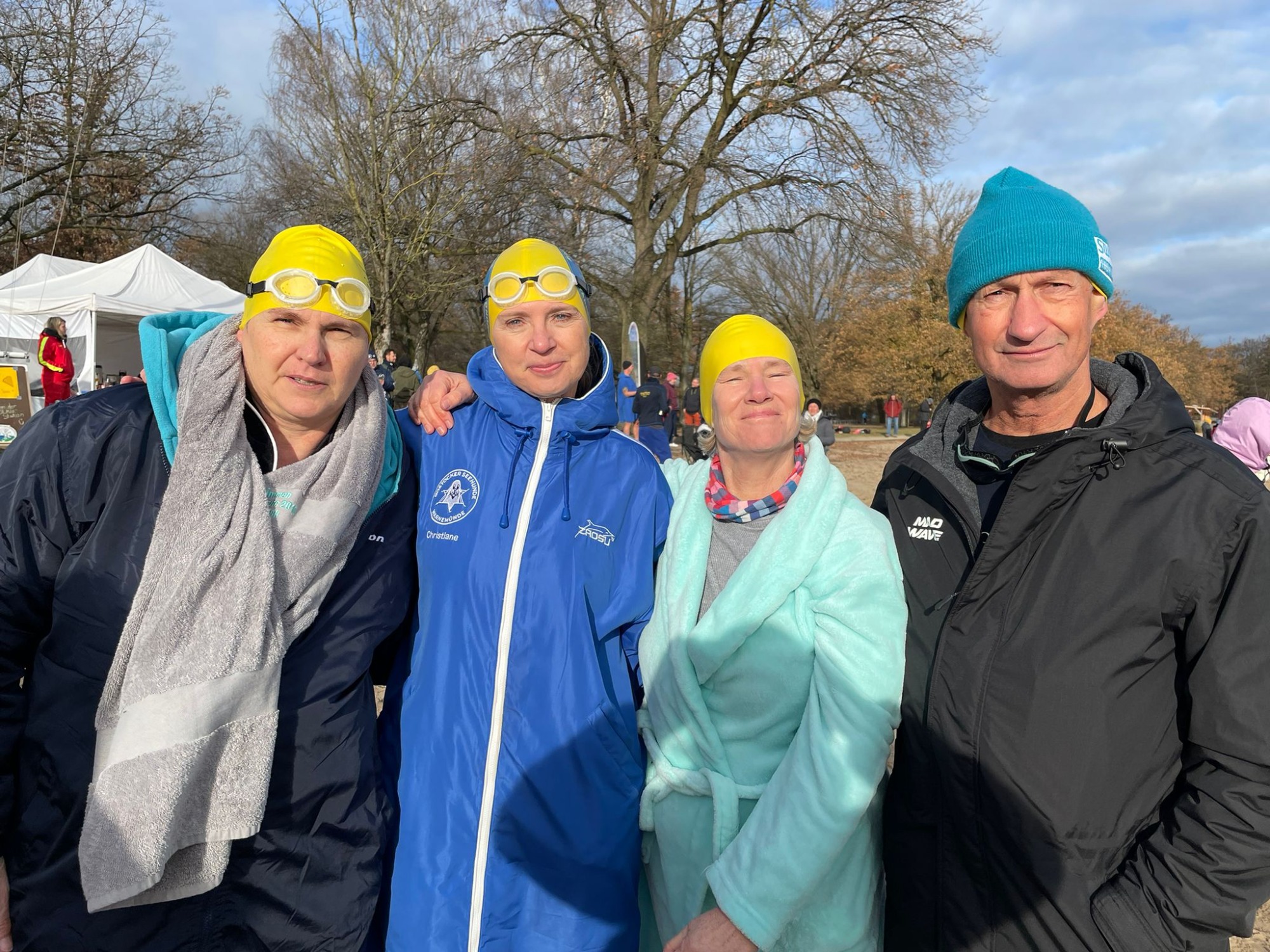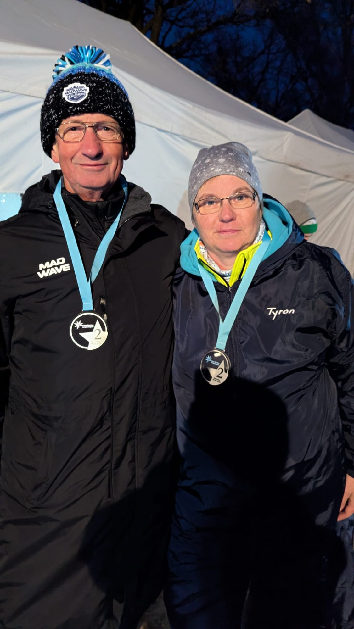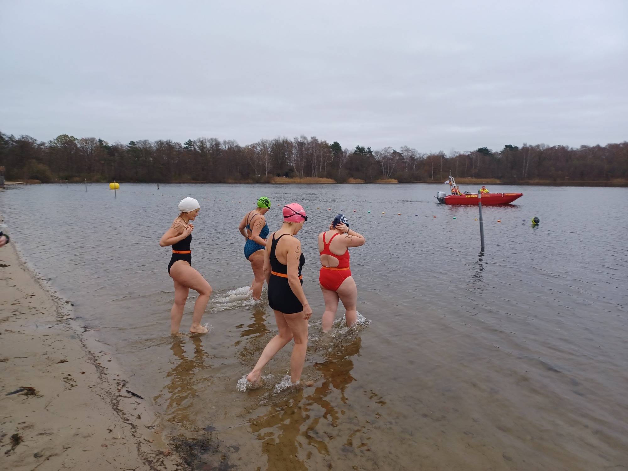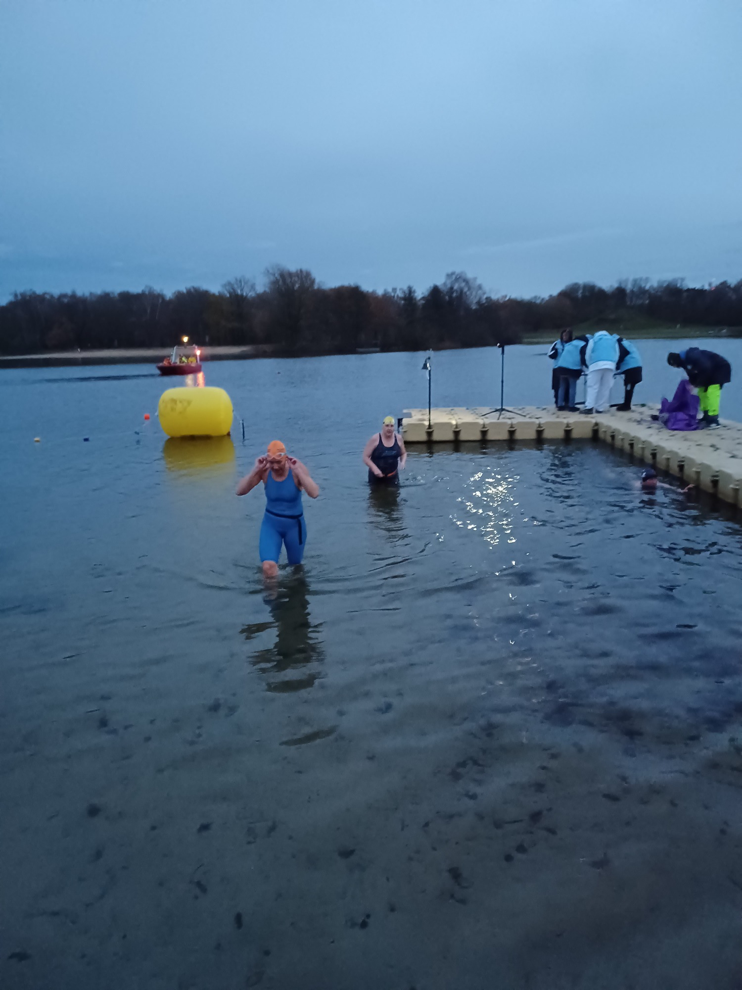 Frisch gestärkt fuhren wir am Samstag früh zum Silbersee. Der empfing uns mit 5,2 °C kaltem Wasser und trüben Wetter. Es waren spannende Wettkämpfe und wir lernten viele Leute kennen bzw. sahen bekannte Gesichter wieder. Der Höhepunkt am Vormittag war die 4 x 50 m Freistil Staffel. Den Sieg der Bruststaffel von Vorjahr konnten wir nicht verteidigen - es waren immerhin 7 starke Staffeln am Start. Die Stimmung war prächtig bei dem bis zum letzten Meter spannenden Rennen. Wir (Uwe, Barbara, Christiane und Heike) schafften den 5. Platz in der Gesamtwertung und waren mächtig stolz auf unsere Leistung. Nach einer kurzen Mittagspause ging es weiter. Am Nachmittag zeigte sich der Silbersee von seiner schönsten Seite, zwischenzeitlich war die Sonne zu sehen. Bei den letzten Starts wurde es schon langsam dunkel und der Mond zeigte sich strahlend am Himmel. Den Wettkampftag haben wir dann gemütlich beim gemeinsamen Abendessen ausklingen lassen und frisch erholt ging es am Sonntag wieder zusammen zum Silbersee. Das Wetter war beständig grau, aber trocken und die Stimmung war super. Gefallen haben uns die vielen Gespräche nach den Starts in der Sauna und in der Hot Tub.